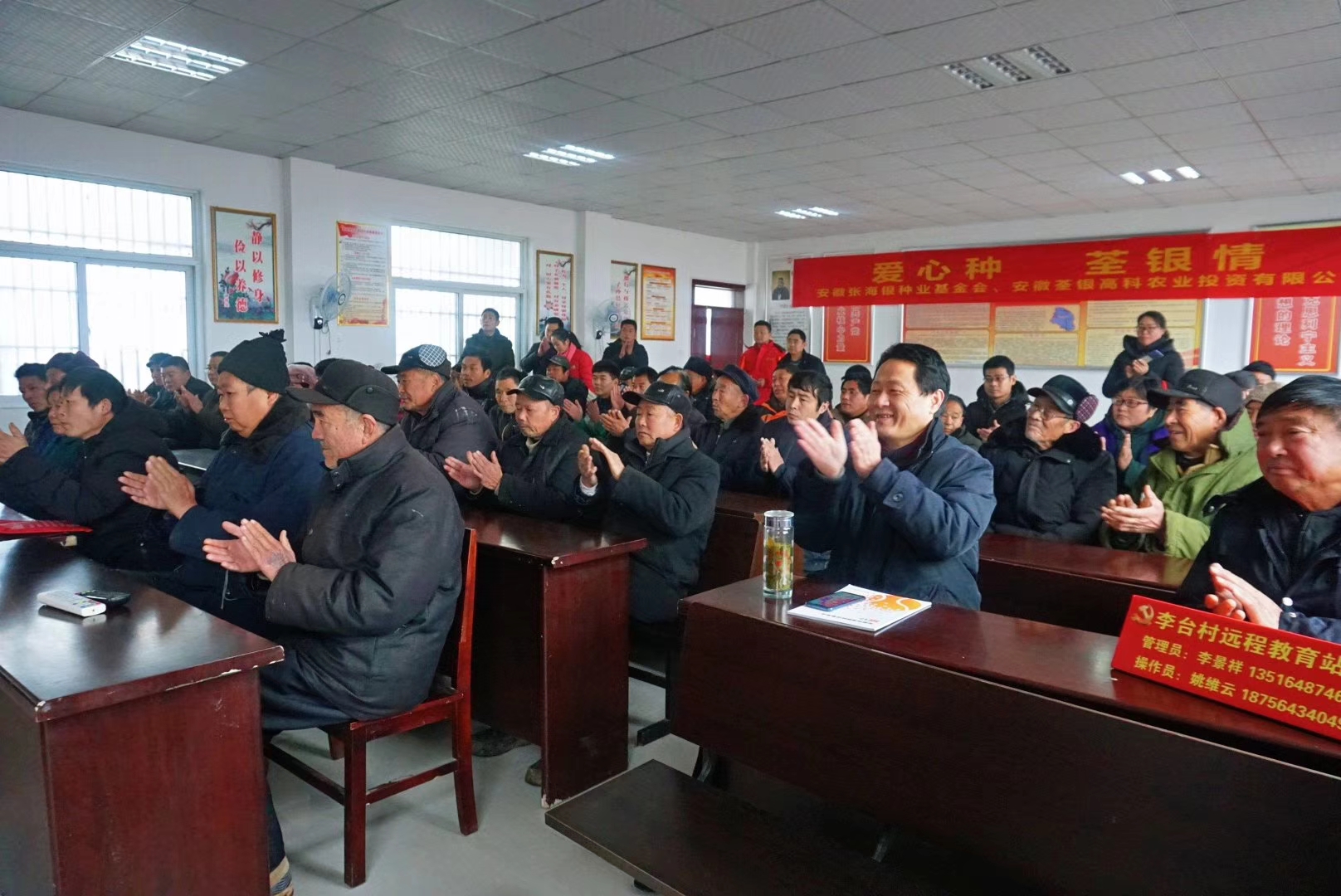 ??? 臘月的古城壽縣,寒風凜冽,壽縣迎河鎮李臺村村委會的會議室卻溫暖如春。1月12日,安徽荃銀高科農投有限公司攜手安徽張海銀種業基金會及壽縣金豐公社有限公司走進壽縣迎河鎮開展“穗悅”精準扶貧項目活動。為當地50戶建檔立卡的貧困戶每戶送去優質水稻種子和化肥。壽縣扶貧辦副主任徐中貴、縣殘聯副理事長陳慶華,壽縣迎河鎮黨委書記李景練、副鎮長戴紹江,基金會秘書長張彤、安徽荃銀高科農投有限公司總經理助理鄭運衛、金豐公社總經理滕玉磊等參加了活動。