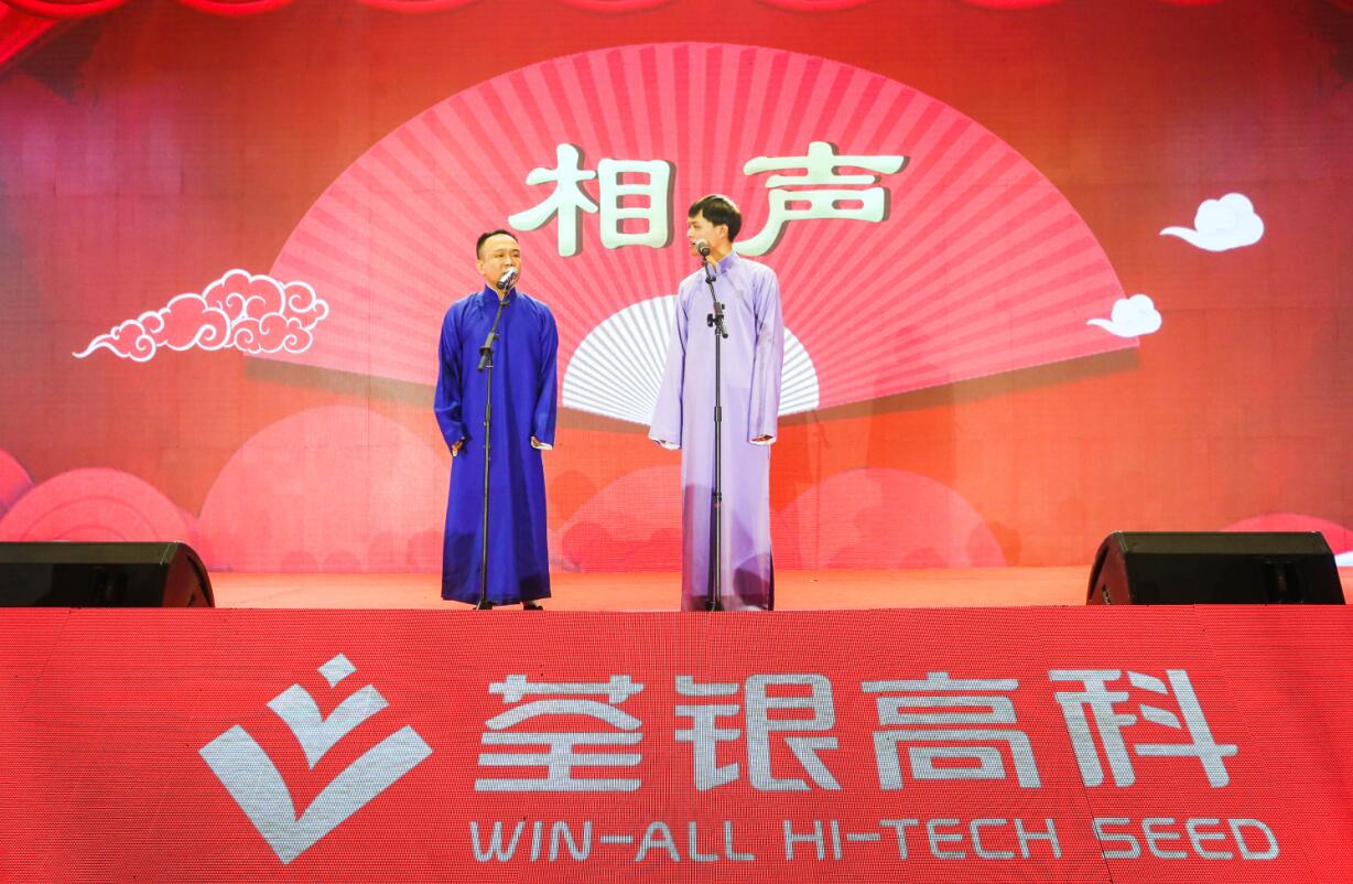 ? ? 聯(lián)歡會以喜慶祥和的歌舞表演《在希望的田野上》拉開序幕,科技公司的《街武》,將武術和街舞結(jié)合,剛?cè)岵朱趴幔挥衩坠镜南嗦暋短着啤罚辣M了一線種子銷售人員的不易;小品《西游記之女兒國2》詼諧幽默,令人捧腹大笑;詩朗誦《我愛祖國,我愛荃銀》殷情并茂,音詩畫《我和我的祖國》大氣恢弘,京歌《我是中國人》激情澎湃,荃銀人用自己的方式歌頌祖國,祝福荃銀。期間,中化農(nóng)業(yè)黨群工作部姚雁主任傾情獻唱《我把太陽迎進祖國》以及黃梅戲選段,獲得掌聲陣陣。整場晚會形式多樣,精彩紛呈,大家載歌載舞,盡顯風采魅力,現(xiàn)場還有互動抽獎,獎品豐厚,引得喝彩不斷。今年是荃銀高科上市十周年,加入中化農(nóng)業(yè)一周年,公司經(jīng)營班子成員及子(分)公司領導在張琴總經(jīng)理帶領下齊聲高唱《今天是你的生日》,為祖國、為荃銀送上由衷的祝福。晚會在高亢的歌聲中圓滿落下帷幕。